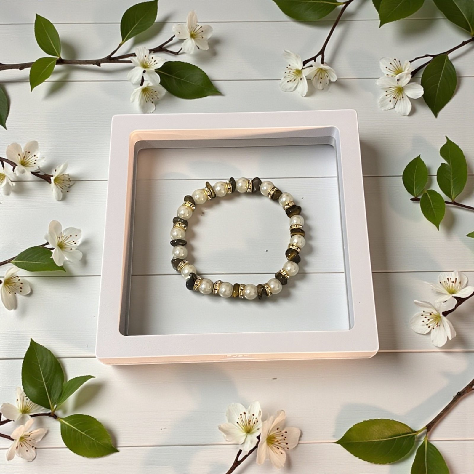 Handcrafted stone jewelry items are made with various stones such as tiger eye, turquoise, agate, and other items such as wood, glass, and metals.